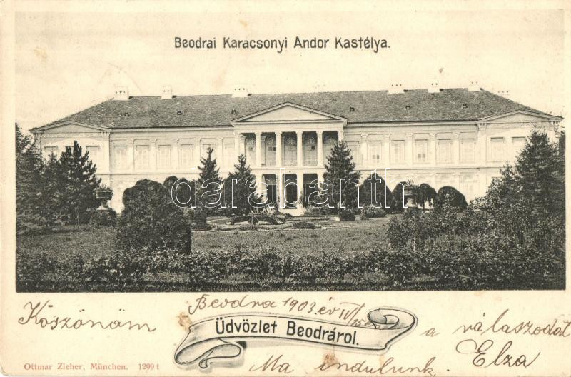 Beodra, Novo Milosevo; Karácsonyi Andor kastélya, Ottmar Zieher kiadás... https://www.darabanth.com/de/282-Fernauktion/282.0/Ansichtskarten/Vojvodina~200012/Beodra-Novo-Milosevo-Karacsonyi-Andor-kastelya-Ottmar-Zieher-kiadasa-castle~II1458006