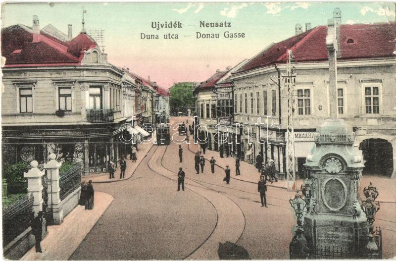 Beschreibung: Újvidék, Novi Sad; Duna utca, villamos, üzletek, sírkőraktár, Ivkovic Milán üzlete és kiadása / street, tram, shops, tombstone warehouse (EK)