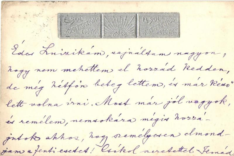 Dr. Wágner Jenő és Emil Vegyészeti Iparvállalata, gyógyszerészeti reklámlap, ezüstös "El Sol Intifriction Metal" dombornyomott felirattal / pharmaceutical advertisement, with silvery embossed text (fa)
