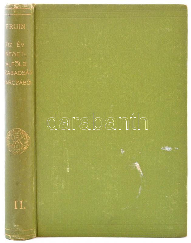 Fruin Róbert: Tíz év a Németalföldi Szabadságharczból (1588-1598) II. kötet. Budapest, 1917, MTA. Kiadói kopottas egészvászon sorozatkötésben, márványozott lapélekkel, ceruzás aláhúzásokkal. Töredék kötet.