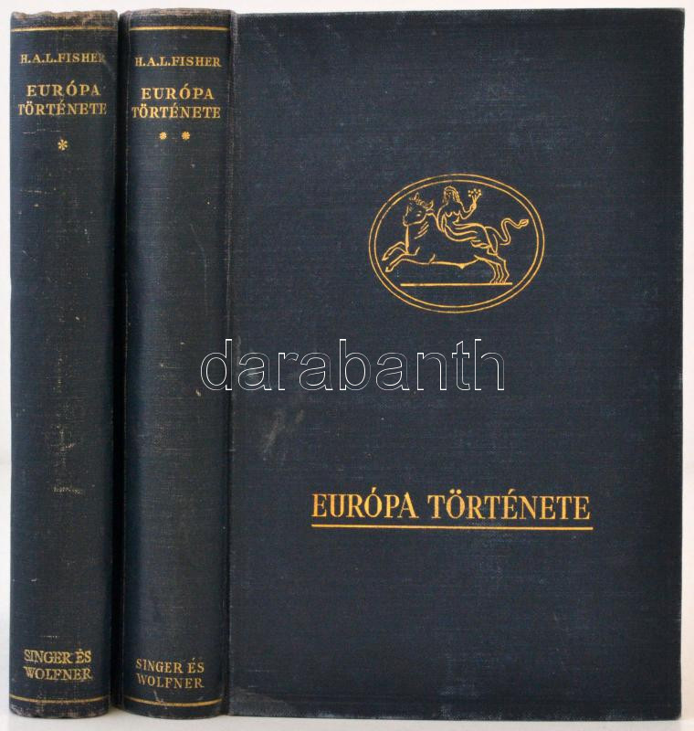H.A.L. Fisher: Európa története I-II. (I. Ókor és középkor. II. Renaissance, reformáció, felvilágosodás.) Fordította: Balla Antal és Benedek Marcell. Budapest, é.n., Singer és Wolfner, 415+459 p. Kiadói egészvászon kötés. Térképekkel illusztrált példány. A borítója kopottas, foltos, A lapok foltosak. Töredék kötet. A III. kötet hiányzik.