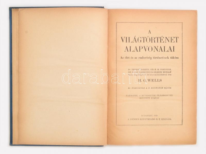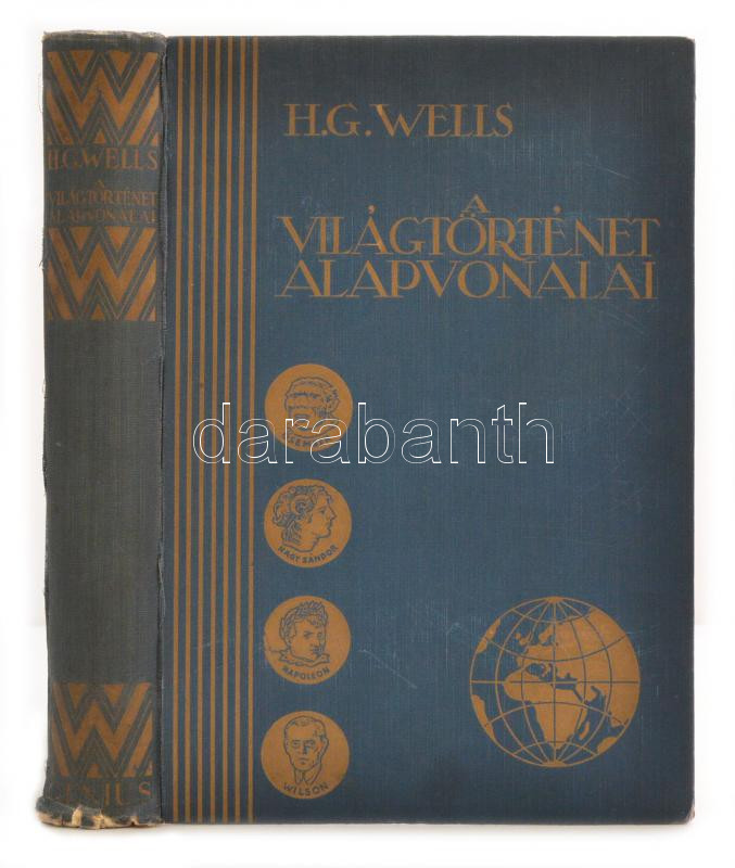 H.G. Wells: A világtörténet alapvonalai. Az élet és az emberiség történetének tüköre. Budapest, 1930, Genius Könyvkiadó Rt. Harmadik, a művészetek fejlődésével bővített kiadás. Kiadói aranyozott egészvászon kötés, némileg meglazult kötéssel.
