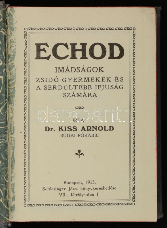 Kiss Arnold: Echod. Imádságok zsidó gyermekek és a serdültebb ifjúság számára. Bp., 1913, Schlesinger József. Kissé kopott vászonkötésben, jó állapotban.