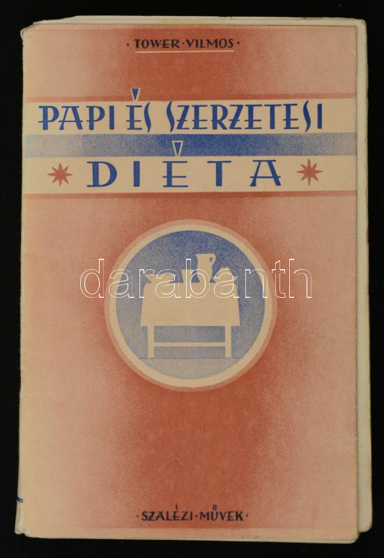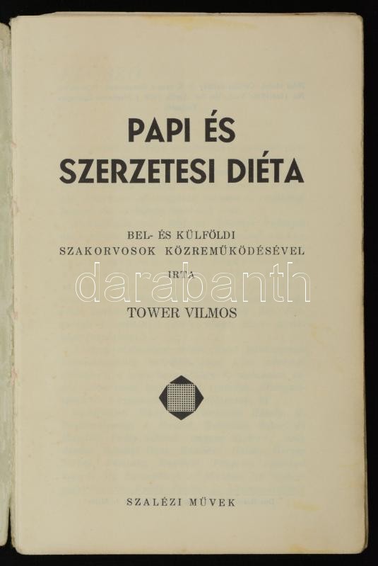 Tower Vilmos: Papi és szerzetesi diéta. (Bp.), 1938, Szalézi Művek. Kiadói papírkötés, kissé szakadozott papírkötéssel, a kötése megviselt, sérült, a könyvtest elvált a borítótól.