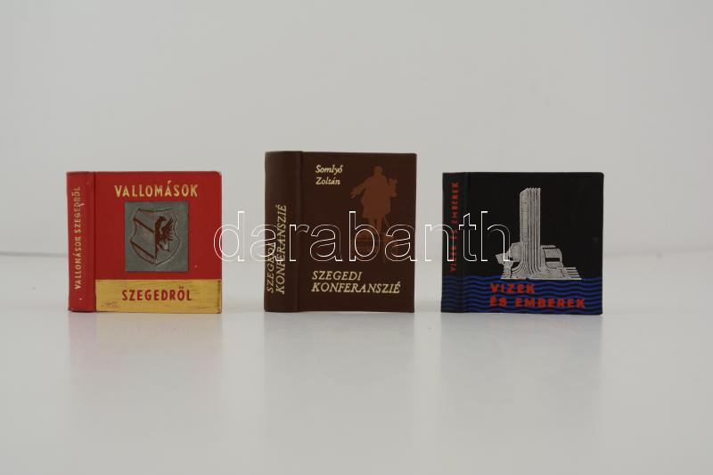 Vegyes, Szegedi vonatkozású minikönyvek, 3 db: Somlyó Zoltán: Szegedi Konferanszié. Szeged, 1982, Szegedi Nyomda MTESZ Miniatűrkönyv Gyűjtő Klub. Kiadói műbőr kötés. Vallomások Szegedről. Szerk.: F. Nagy István, Sz. Simon István. Szeged, 1974, Szegedi Nyomda. Megjelent 1000 példányban. Vizek és emberek. Antológia a szegedi nagy árvízekről. Szerk.: Sz. Simon István. Szeged, 1979, Szegedi Nyomda MTESZ Miniatűrkönyv Gyűjtő Klub. Kiadói műbőr kötés.