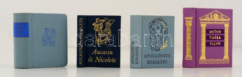 Vegyes minikönyv tétel, 4 db.: Longosz: Daphnisz és Khloé. Fordította Déthsy Mihály. Illusztrálta Aristide Maillol. Bp., 1966, Magyar Helikon. Kiadói műbőr kötés. Kardos Gyula: Heten Théba ellen. Bp., 1977, Egyetemi Nyomda Miniatűrkönyv Gyűjtő Klubja. Kiadói műbőr kötés, magyar, orosz és angol nyelven. Megjelnt 450 példányban. Apollonius királyfi. Elveszett görög mű V. századi latin feldolgozásban. Fordította Révay József. Illusztrálta Kass János. Bp., 1973, Európa Könyvkiadó. Kiadói egészvászon kötés. Aucasin és Nicolete. Ófrancia széphistória. Fordította Tóth Árpád. Illusztrálta Engel Tevan István. Bp., 1972, Európa könyvkiadó. Kiadói aranyozott egészvászon kötés. Megjelent 1850 példányban.