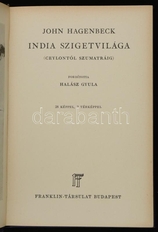 John Hagenbeck: India szigetvilága. (Ceylontól szumátráig.) Világjárók. Utazások és kalandok. Fordította Halász Gyula. Budapest, é.n., Franklin-Társulat. Kiadói egészvászon kötés, fekete-fehér fotókkal, kissé kopottas gerinccel.