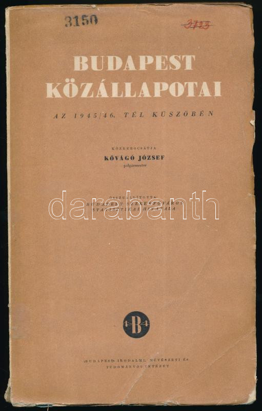 Kővágó József: Budapest közállapotai az 1945/46 tél küszöbén. Szerk.: Budapest Székesfőváros Statisztikai Hivatala. Budapest, 1946, Budapest Irodalmi, Művészeti és Tudományos Intézet. Kiadói papírkötés, kissé szakadt gerinccel, szövegközti ábrákkal illusztrálva. Jó állapotban.