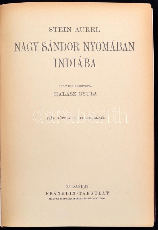 Stein Aurél: Nagy Sándor nyomában Indiába. Angolból fordította Halász Gyula. 100 képpel és térképpel. A Magyar Földrajzi Társaság Könyvtára. Bp., é.n., Franklin-Társulat. Kiadói díszes, aranyozott, egészvászon-kötésben.