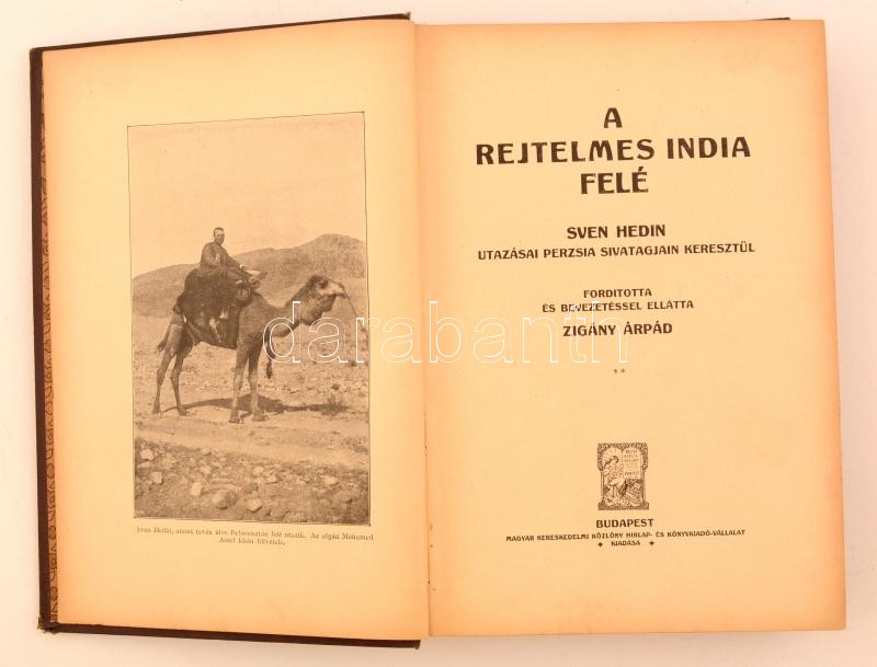 Sven Hedin: A rejtelmes India. Sven Hedin utazása Perzsia sivatagjain keresztül. Fordította és bevezetéssel ellátta Zigány Árpád. Budapest, é.n. [1912], Magyar kereskedelmi Közlöny, 554 p. Sok fényképpel, rajzzal illusztrált kiadvány. Kiadói dombornyomott, gazdagon díszített, egészvászon kötés. A gerince és a kötése kissé elvált.