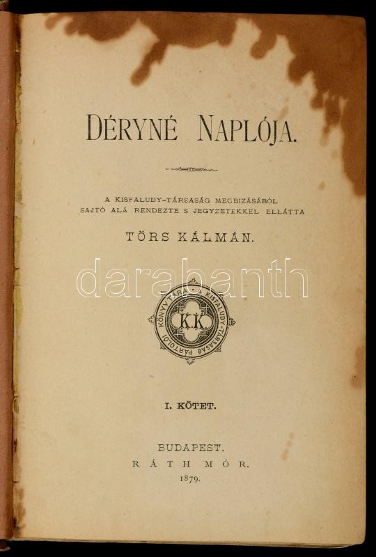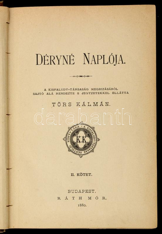 Déryné naplója. A Kisfaludy társaság megbízásából sajtó alá rendezte és jegyzetekkel ellátta Törs Kálmán. I.-II. kötet. Bp., 1879. Ráth Mór. Korabeli aranyozott, egészvászon kötésben II. kötet gerince szakadt. Ritka!