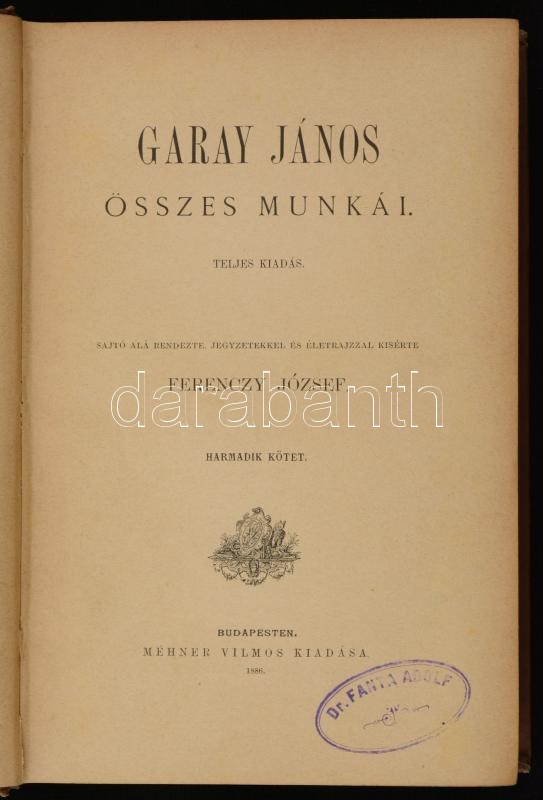 Garay János összes munkái III. Sajtó alá rendezte, jegyzetekkel és életrajzzal kísérte: Ferenczy József. Bp., 1886, Méhner Vilmos. Első teljes kiadás. Kiadói gazdagon aranyozott, festett egészvászon kötés, márványozott lapélekkel, a borító és a gerinc széleinél, sarkainál kissebb kopás nyomokkal, ex-libris bélyegzővel, jó állapotban. Csak harmadik kötet.