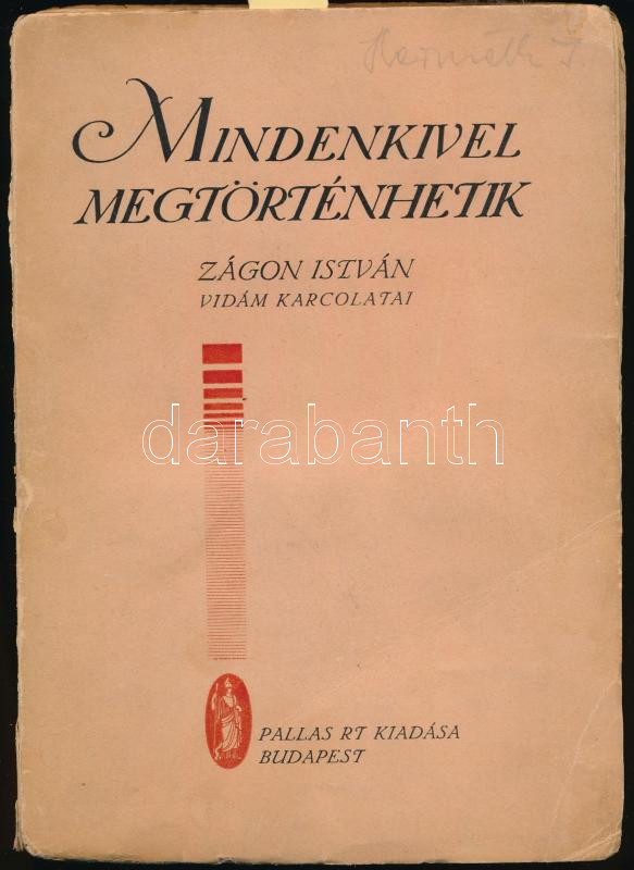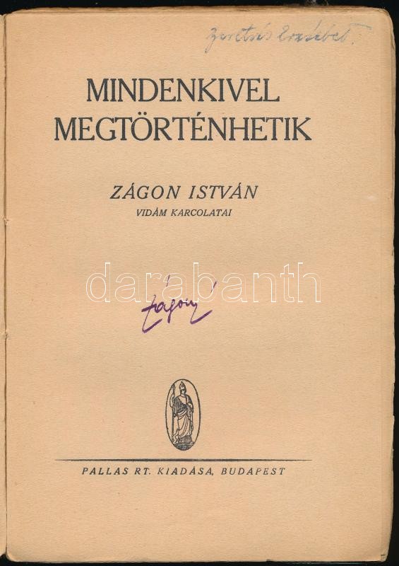 Zágon István: Mindenkivel megtörténhetik. Budapest, é.n., Pallas Rt. Kiadói papírkötésben, pár lap foltos. A címlapon Zágon István aláírásával, tulajdonosi névbejegyzéssel.
