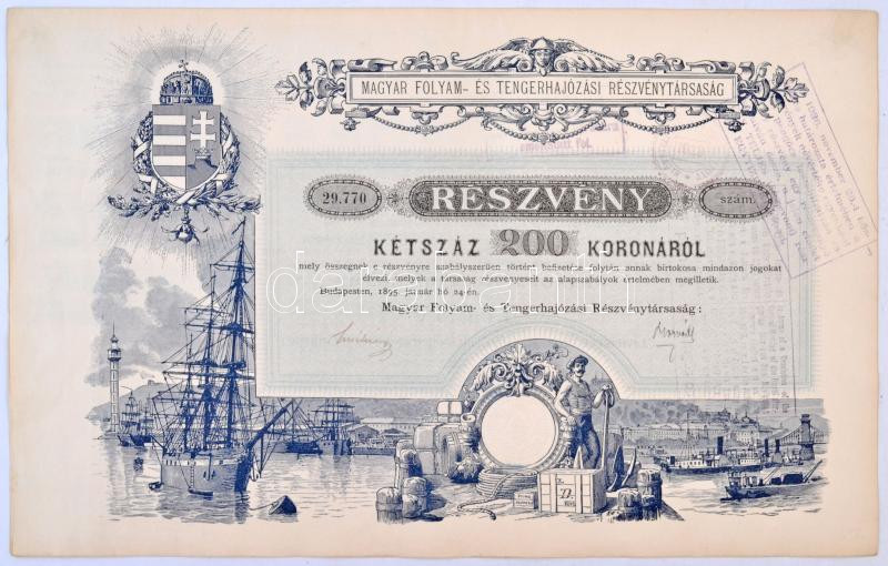 Budapest 1895. "Magyar Folyam- és Tengerhajózási Részvénytársaság... https://www.darabanth.com/de/282-Fernauktion/282.0/Numismatik/Aktien-und-Tickets~300004/Budapest-1895-Magyar-Folyam-es-Tengerhajozasi-Reszvenytarsasag-reszvenye-200K-rol-vi~II1458918