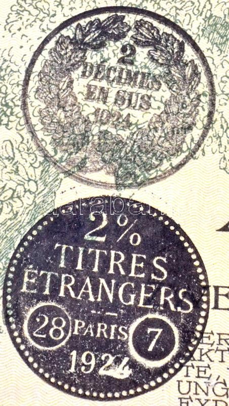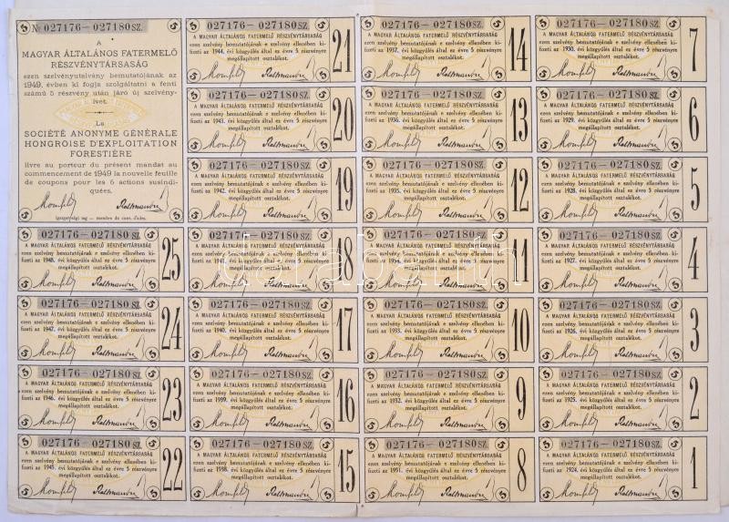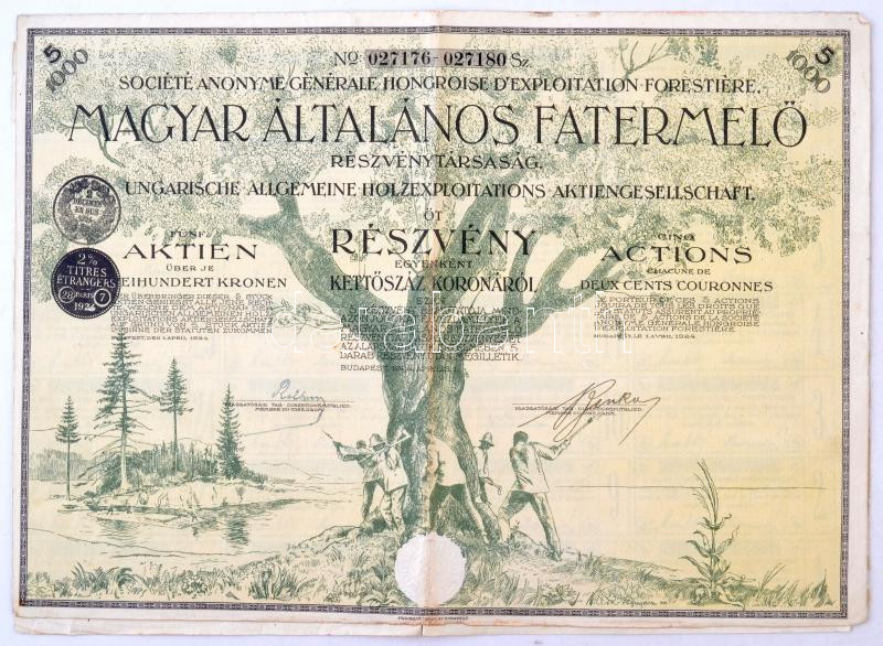Budapest 1924. "Magyar Általános Fatermelő Részvénytársaság" öt részvénye egyenként 200K-ról, magyar, német és francia nyelven, szárazpecséttel, bélyegzésekkel és teljes szelvényívvel T:III tűly.