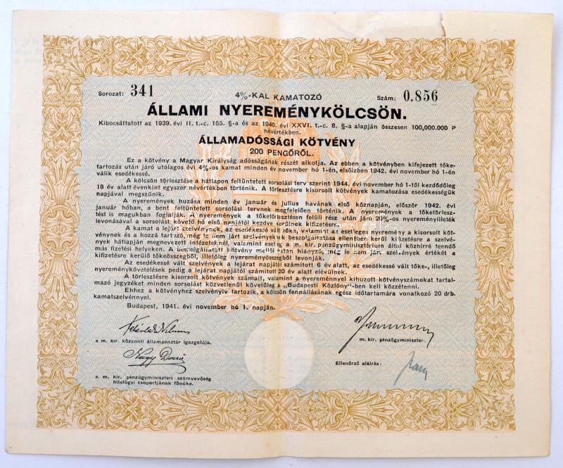 Budapest 1941. "4%-kal kamatozó állami nyereménykölcsön - államad... https://www.darabanth.com/de/282-Fernauktion/282.0/Numismatik/Aktien-und-Tickets~300004/Budapest-1941-425-kal-kamatozo-allami-nyeremenykolcson--allamadossagi-kotveny-200P-rol~II1409345