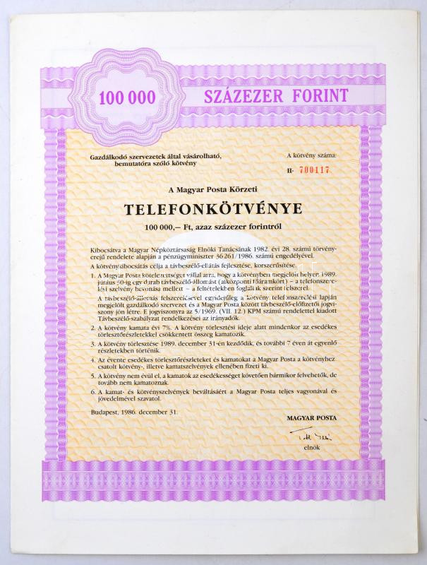 Beschreibung: Budapest 1986. "Magyar Posta Körzeti Telefonkötvénye" 100.000Ft-ról T:I-,II