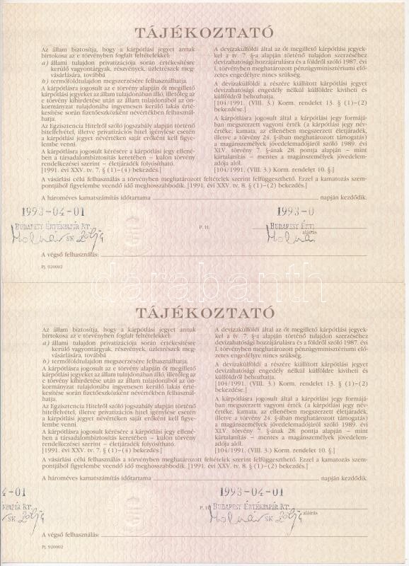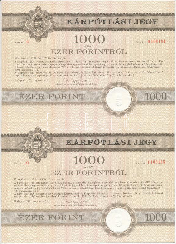 Beschreibung: Budapest 1991. "Országos Kárrendezési és Kárpótlási Hivatal" kárpótlási jegye 1000Ft-ról, "C" sorozat, sorszámkövetők T:I-