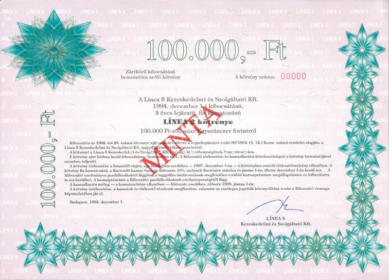 Budapest 1994. "LÃnea 5 kereskedelmi és Szolgáltató Kft. LÃnea 2&... https://www.darabanth.com/de/282-Fernauktion/282.0/Numismatik/Aktien-und-Tickets~300004/Budapest-1994-Linea-5-kereskedelmi-es-Szolgaltato-Kft-Linea-2-kotvenye-100000Ft-rol-M~II1457112