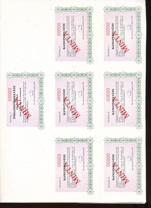 Beschreibung: Budapest 1994. "LÃnea 5 kereskedelmi és Szolgáltató Kft. LÃnea 2" kötvénye 100.000Ft-ról, "MINTA", szelvényekkel + Budapest 1994. "Odicon Kft. Kvadrát 1" kötvénye 100.000Ft-ról, "MINTA", szelvényekkel,"00000"-ás sorszám T:I-