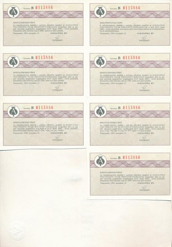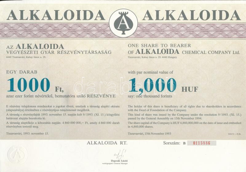 Tiszavasvári 1993. "Alkaloida Vegyészeti Gyár Részvénytársaság&qu... https://www.darabanth.com/de/282-Fernauktion/282.0/Numismatik/Aktien-und-Tickets~300004/Tiszavasvari-1993-Alkaloida-Vegyeszeti-Gyar-Reszvenytarsasag-reszvenye-1000Ft-rol-magy~II1457025