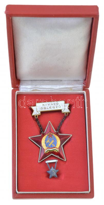 Beschreibung: ~1950. "Kiváló Dolgozó" Rákosi-címeres zománcozott fém kitüntetés miniatűrrel dísztokban T:2