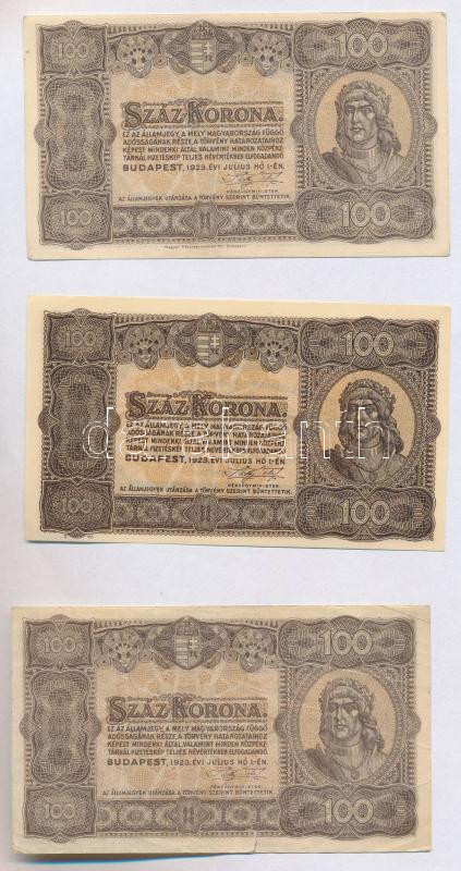 1923. 100K (3x) egyik "Magyar Pénzjegynyomda Rt. Budapest" j... https://www.darabanth.com/de/282-Fernauktion/282.0/Numismatik/Ungarische-Banknoten~300006/1923-100K-3x-egyik-Magyar-Penzjegynyomda-Rt-Budapest-jelolessel-a-tobbi-nyomdahely-nelkC3~II1456795