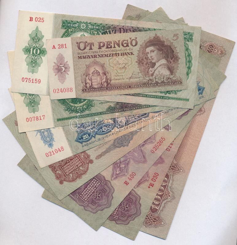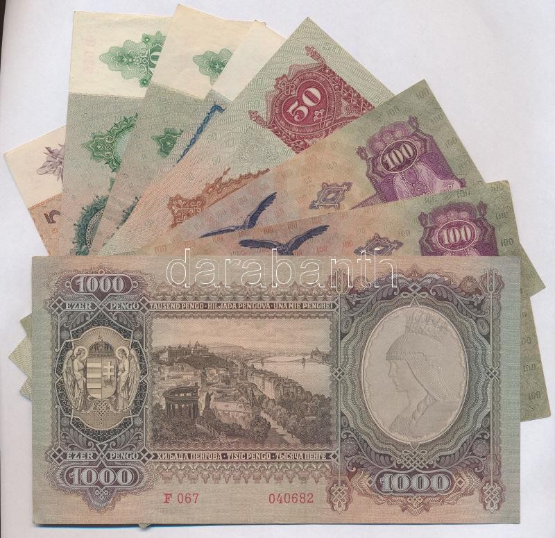 1930-1943. Pengő sor, benne: 1939. 5P + 1936. 10P + 1936. 10P csillagos betűjel + 1941. 20P + 1932. 50P + 1930. 100P + 1930. 100P csillagos sorozatszám + 1943. 1000P T: Adamo P6, P9, P9A, P12, P14, P17, P17A, P21