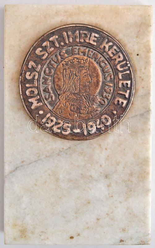 1940. "MOLSZ Szt. Imre Kerülete 1925-1940 / Sanctus Emericvs 1930" ezüstözött Br emlékérem, márványtalpon, hátoldalon "LUDWIG ÉREMVERŐ BPEST VIII. THÉKE. U. 18. AZ ÖSSZES NAGY EGYESÜLETEK ÉS SZÖVETSÉGEK SZÁLLÍTÓJA" (64mm / 82x132mm) T:2