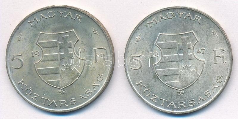 1947. 5Ft Ag "Kossuth" (2x) T:2,2- https://www.darabanth.com/de/282-Fernauktion/282.0/Numismatik/Ungarische-Munzen-und-Munzen-mit-ungarischem-Munzzeichen~300007/1947-5Ft-Ag-Kossuth-2x-T2-2-~II1455302