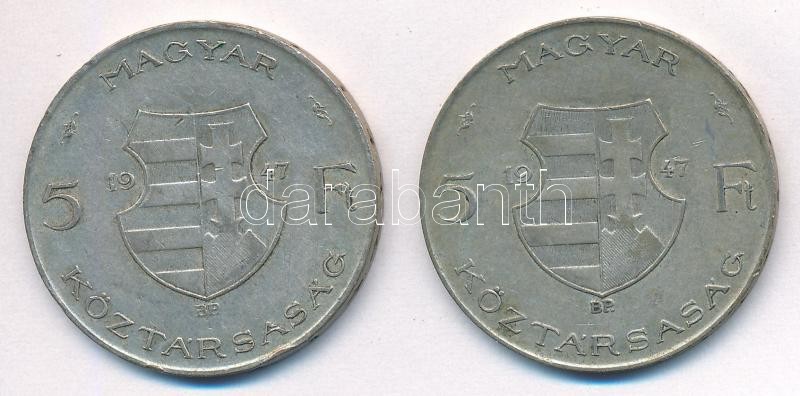 1947. 5Ft Ag "Kossuth" (2x) T:2- kis ph. https://www.darabanth.com/de/282-Fernauktion/282.0/Numismatik/Ungarische-Munzen-und-Munzen-mit-ungarischem-Munzzeichen~300007/1947-5Ft-Ag-Kossuth-2x-T2-kis-ph~II1455311