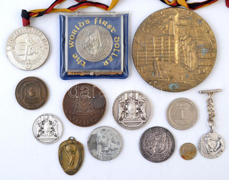 14db-os vegyes külföldi emlékérem és katonai emlékérem tétel, közte Amerikai Egyesült Államok DN "101. légi szállítású hadosztály" Br emlékérem (38,5mm), Csehország / történelmi tartomány 1520. Tallér "Szent Joachim" ezüstözött fém 1967-es másolat (2x) egyik "A világ első dollárja" tokban, francia nyelvű leírással (42mm) T:2,2- 14pcs of various commemorativ medals and military medals, including USA ND "101st Airborne Division" Br commemorativ medal (38,5mm), Bohemia 1520. Joachimsthaler silver plated metal copy (1967) (2x) one is in "The World's First Dollar" case with French description (42mm) C:XF,VF