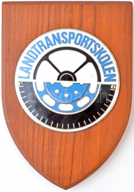 Dánia DN "Landtransportskolen (Szárazföldi Közlekedési Iskola)" fém plakett fa talpon, akasztóval (plakett: 90mm fa talp: 165x114,5mm) T:2 Denmark ND "Landtransportskolen (Land Transport School)" metal plaque on wooden base, with hanger (plaque: 90mm base:165x114,5mm) C:XF