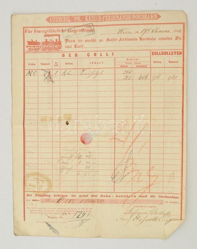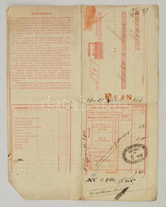 1853 Kaiser-Ferdinans-Nordbahn vasúti fuvarlevél https://www.darabanth.com/de/283-Fernauktion/283.0/Andere-Sammelgebiete/Dokument~17/1853-Kaiser-Ferdinans-Nordbahn-vasuti-fuvarlevel~II1460802