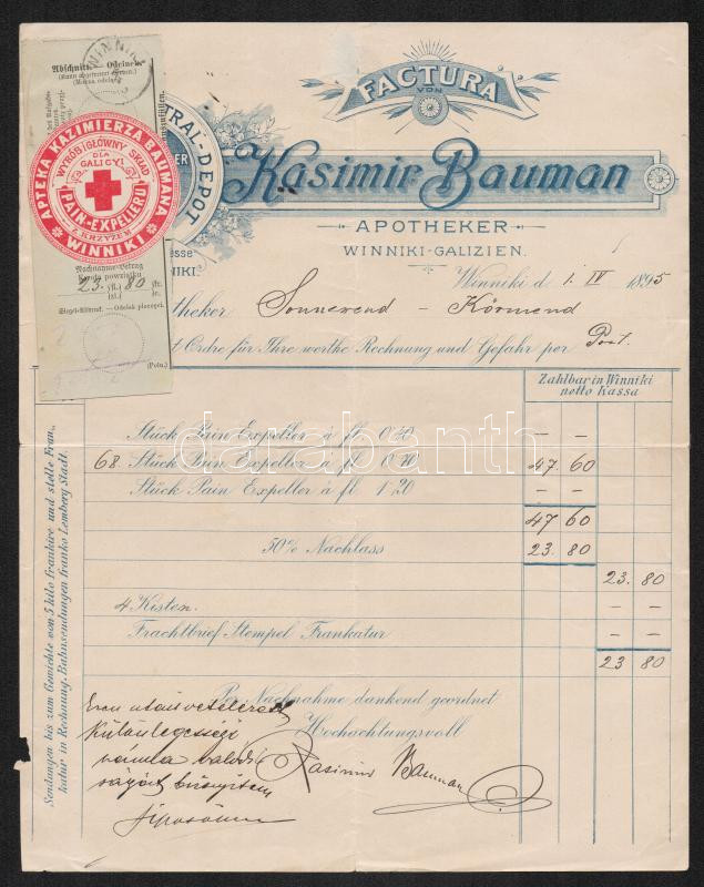 Beschreibung: 1895 Kasimir Bauman, galíciai gyógyszerész díszes fejléces számlája / Apotheker Winniki, Galizien (Wynnyky) Rechnung