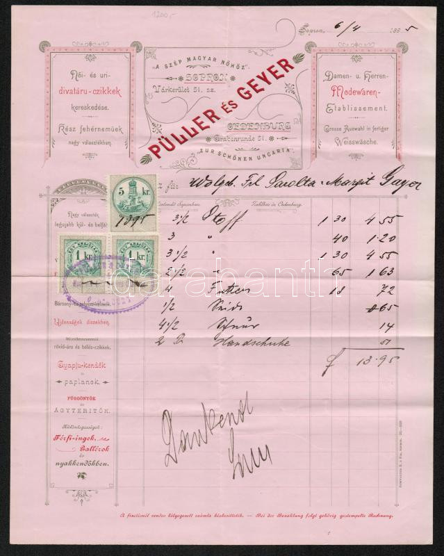 Beschreibung: 1895 Püller és Geyer divatáru kereskedése 'A szép magyar nőhöz' Sopron, Várkerület 51. sz. Díszes fejléces számla 7 kr okmánybélyeggel