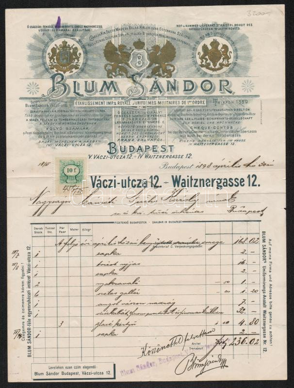 1898 Blum Sándor, cs. és kir. osztrák-magyar és belga királyi szab. egyenruha szállító, Budapest Váci utca 12. díszes fejléces számla 10 f okmánybélyeggel