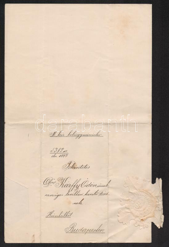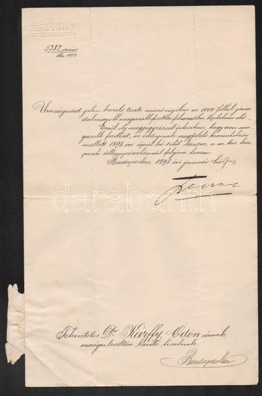 Beschreibung: 1898 Dr. Kárffy Ödön történész, levéltáros, fizetésemelési értesítése, Magyar Királyi Belügyminisztérium levele, Perczel Dezső (1848-1913) belügyminiszter aláírásával, szárazbélyeggel, okmánybélyeggel.