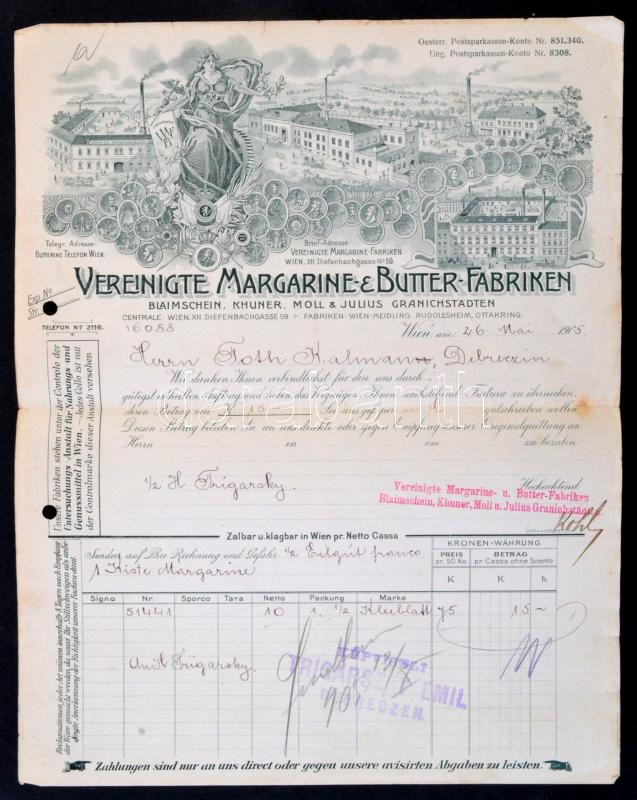 1905 Decorative invoice of the Wien-based company, the Vereinigte Margarine & Butter-Fabrik, it filled up from the agency of Debrecen.