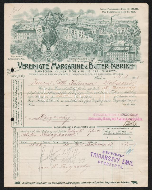 1905 Vereinigte Margarine & Butter-Fabrik bécsi székhelyű társaság díszes számlája, debreceni képviselet által kiállítva. / 1905 Decorative invoice of the Wien-based company, the Vereinigte Margarine & Butter-Fabrik, it filled up from the agency of Debrecen.