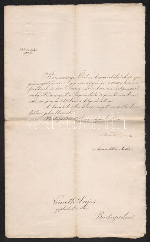 1908 Bp., A képviselőház elnöke által küldött gépészsegédi kinevező ok... https://www.darabanth.com/de/283-Fernauktion/283.0/Andere-Sammelgebiete/Dokument~17/1908-Bp-A-kepviselohaz-elnoke-altal-kuldott-gepeszsegedi-kinevezo-okmany-alairassa~II1465530