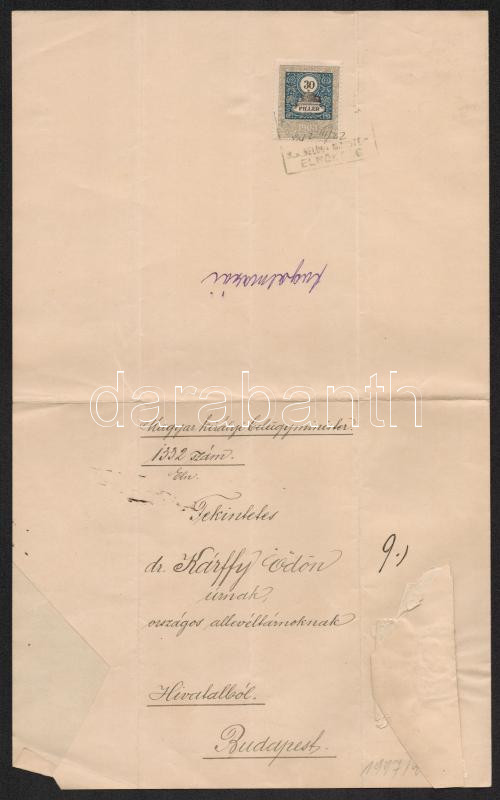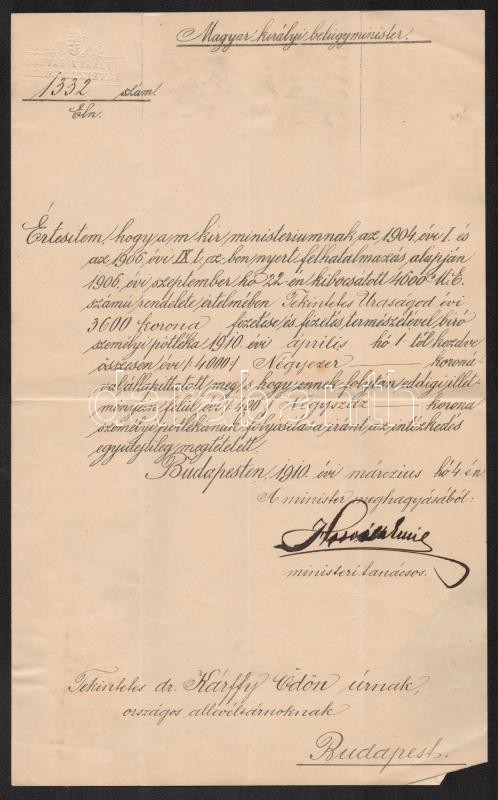 1910 Dr. Kárffy Ödön történész, levéltáros, fizetésemelési értesítése, a Magyar Királyi Belügyminisztérium levele, Horváth Emil miniszteri tanácsos aláírásával, szárazbélyeggel, okmánybélyeggel.