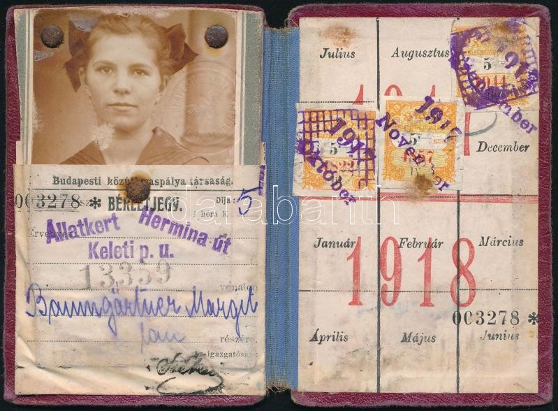 1917-18 Budapest közúti vaspálya társaság, tanuló bérletjegy (Állatker... https://www.darabanth.com/de/283-Fernauktion/283.0/Andere-Sammelgebiete/Dokument~17/1917-18-Budapest-kozuti-vaspalya-tarsasag-tanulo-berletjegy-Allatkert--Hermina-ut-Kelet~II1470153