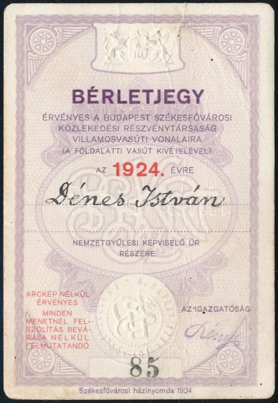 Beschreibung: 1924 Budapest Székesfővárosi Közlekedési Részvénytársaság villamosvasúti bérletjegy Dénes István nemzetgyűlési képviselő részére