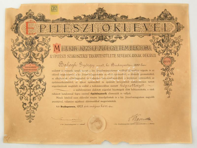 1925 Építészmérnök diploma kissé megviselt állapotban. https://www.darabanth.com/de/283-Fernauktion/283.0/Andere-Sammelgebiete/Dokument~17/1925-Epiteszmernok-diploma-kisse-megviselt-allapotban~II1469676