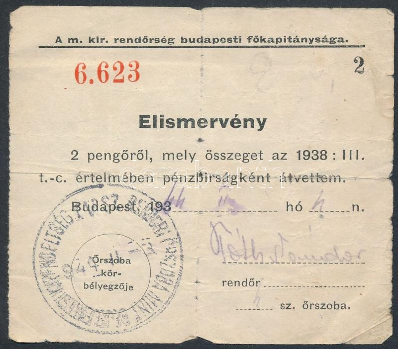 Beschreibung: 1944 Bp., A M. kir. rendőrség budapesti főkapitánysága által kiállított elismervény pénzbírság megfizetéséről