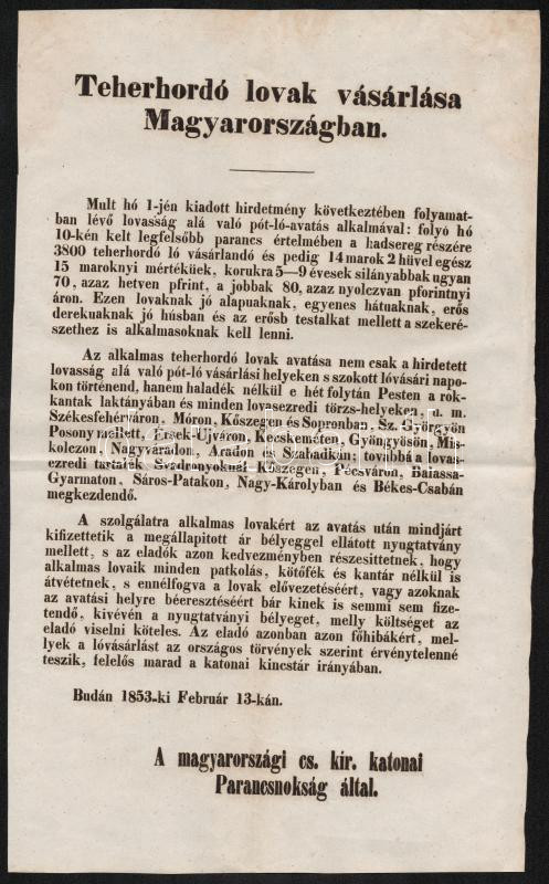 Beschreibung: 1853 Teherhordó lovak vásárlása Magyarországban. A magyarországi cs. és kir. katonai parancsnokság által kiadott hirdetmény, 36×24 cm