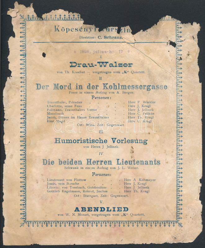 1898 Köpcsényi Várszínház plakátja, német nyelven, megviselt állapotba... https://www.darabanth.com/de/283-Fernauktion/283.0/Andere-Sammelgebiete/Drucksachen~28/1898-Kopcsenyi-Varszinhaz-plakatja-nemet-nyelven-megviselt-allapotban-23x19-cm~II1427490