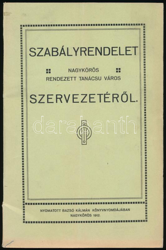 1912 Szabályrendelet Nagykőrös rendezett tanácsű város szervezetéről, ... https://www.darabanth.com/de/283-Fernauktion/283.0/Andere-Sammelgebiete/Drucksachen~28/1912-Szabalyrendelet-Nagykoros-rendezett-tanacsu-varos-szervezeterol-nyomatott-Bazso-Kalm~II1463248