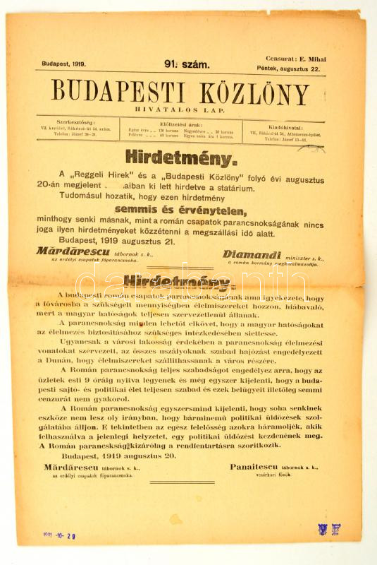 Beschreibung: 1919 Budapesti Közlöny, 1919. augusztus 22., 91. szám, a megszálló román parancsnokság közleményével.